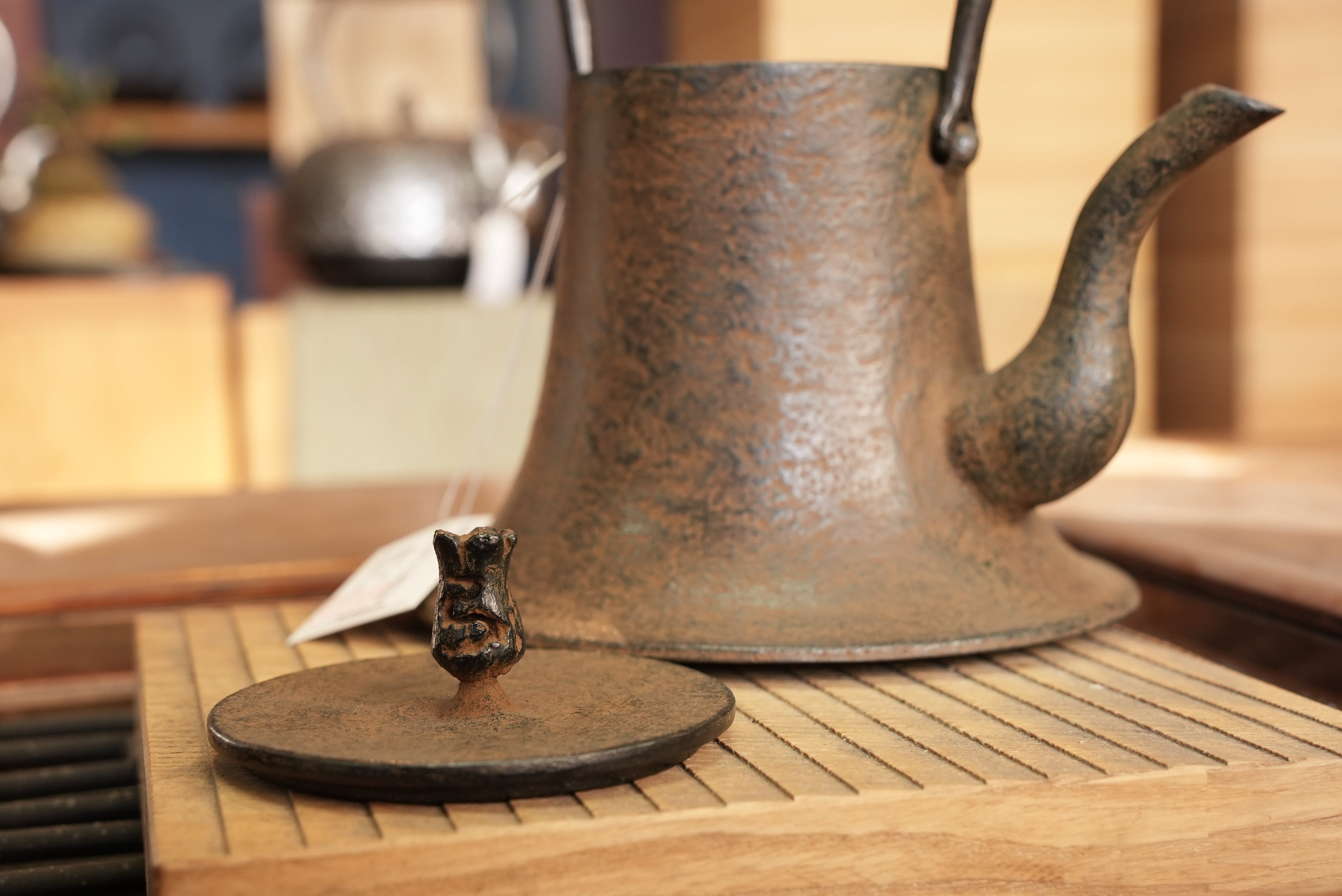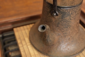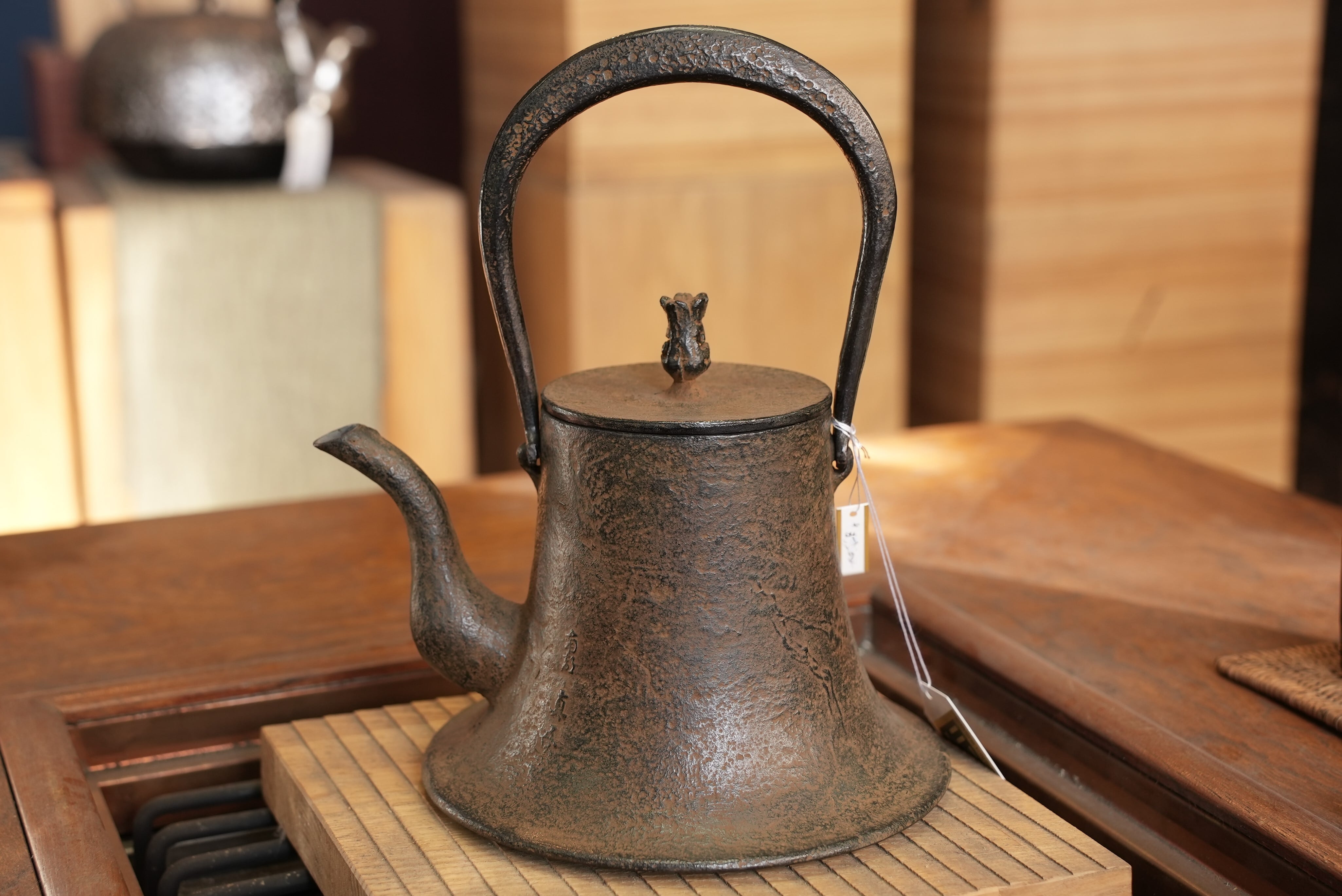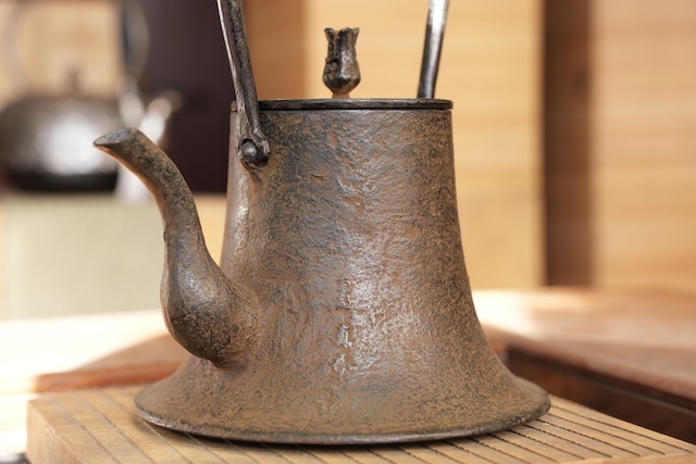 持ち手は鉄の板を叩いて鍛造によって造型されている、貴重なツルです。これにより、持ち手があつくなりにくい機能とともに、古びたワビサビの味わいを表現する美的表現です。